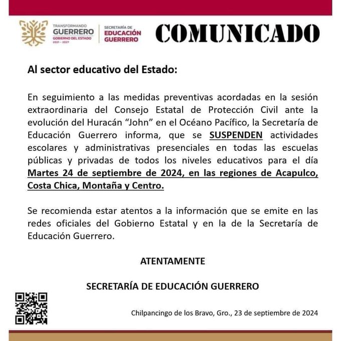 Además, se pidió a la población evitar construir cerca de canales y tomar medidas preventivas. Por otro lado, la Secretaría de Educación de Guerrero suspendió clases en varias regiones para el martes 24 de septiembre y recomendó estar atentos a los avisos sobre posibles extensiones.