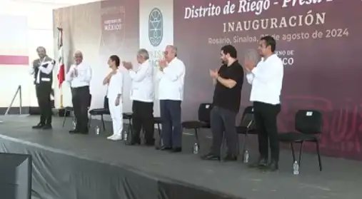 - El presidente López Obrador y la presidenta electa Claudia Sheinbaum respaldan al gobernador de Sinaloa, Rubén Rocha Moya, durante la inauguración del distrito de riego Picachos.