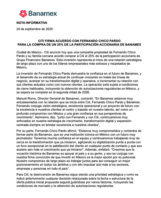 Citi anunció la venta del 25% de las acciones de Banamex a Fernando Chico Pardo, uno de los empresarios más influyentes de México. La operación asciende a 42 mil millones de pesos y está sujeta a autorizaciones regulatorias, con cierre previsto para la segunda mitad de 2026.
