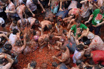 La localidad valenciana de Buñol celebró su famosa Tomatina, donde 120.000 kilos de tomates tiñeron de rojo sus calles. Este año, en su 77ª edición, se introdujo una opción VIP, donde algunos pagaron 500 euros para disfrutar la fiesta desde los camiones que transportaban los tomates.