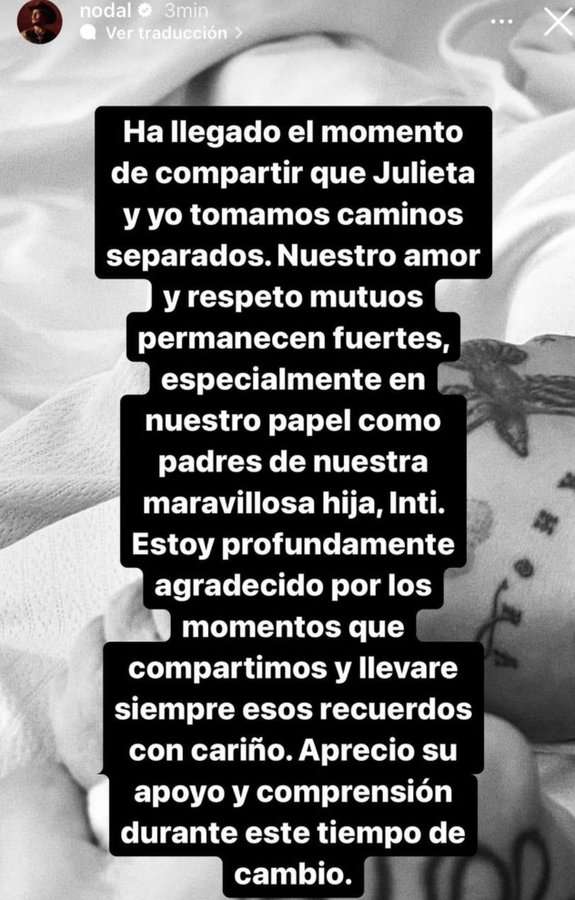 “Ha llegado el momento de compartir que Julieta y yo tomamos caminos separados. Nuestro amor y respeto mutuos permanecen fuertes, especialmente en nuestro papel como padres de nuestra hija, Inti. Estoy profundamente agradecido por los momentos que compartimos y llevaré siempre esos recuerdos con cariño”, escribió Nodal, mensaje que fue reposteado por Cazzu.