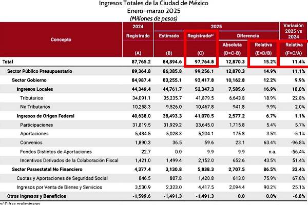 La Secretaría de Administración y Finanzas (SAF) de la Ciudad de México reportó un crecimiento de 15.2% en los ingresos totales del primer trimestre de 2025, con respecto a lo previsto en la Ley de Ingresos, y 11.4% más en comparación con el mismo periodo de 2024, según el informe entregado al Congreso capitalino.