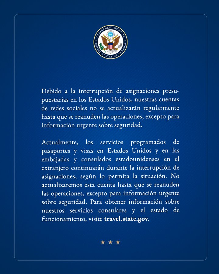 La representación diplomática informó que sus redes sociales dejarán de actualizarse con regularidad y solo difundirán información en caso de alertas de seguridad o mensajes de carácter urgente. A su vez, recomendó a los usuarios consultar el portal oficial travel.state.gov para conocer el estado de los trámites y servicios consulares.