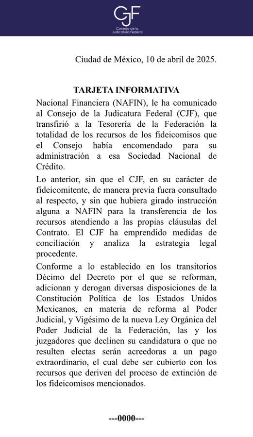 El Consejo de la Judicatura Federal (CJF) denunció que Nacional Financiera (Nafin) transfirió, sin su autorización ni consulta previa, 10 mil millones de pesos a la Tesorería de la Federación. Los fondos provenían de cuatro fideicomisos del Poder Judicial que estaban bajo resguardo de Nafin.