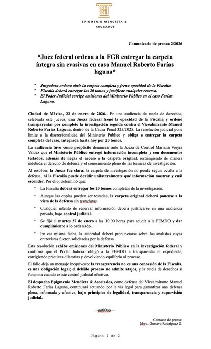 El despacho Epigmenio Mendieta & Asociados, representante legal del contraalmirante Fernando Farías Laguna y del vicealmirante Manuel Roberto Farías Laguna, informó que una jueza federal ordenó la entrega completa de los 20 tomos que integran la investigación, sin testaduras ni omisiones.
