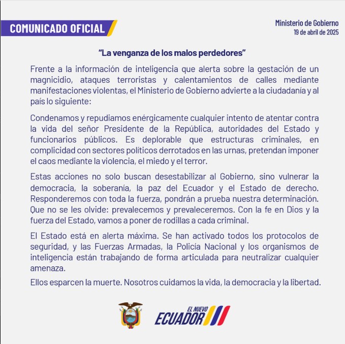 “Estas acciones no solo buscan desestabilizar al Gobierno, sino afectar la democracia, la paz y el Estado de derecho en Ecuador”, indicó el Ministerio de Gobierno. También aseguró que responderán con firmeza ante cualquier amenaza: “No nos van a doblegar. Vamos a enfrentar con toda la fuerza del Estado a cada criminal”.