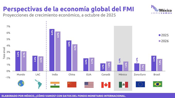 Para 2026, el crecimiento mexicano subiría a 1.5%, mientras que Brasil mantendría un avance del 2.4%. El FMI recomendó a México fortalecer su infraestructura, mejorar la seguridad jurídica y consolidar su integración comercial para sostener el crecimiento a largo plazo.