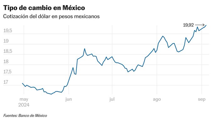 El miércoles 4 de septiembre, el peso mexicano terminó en 19.92 unidades por dólar, mostrando una caída del 0.71%. Esta disminución se produjo después de que la Cámara de Diputados aprobara una reforma al sistema de justicia que propone elegir por voto popular a jueces, magistrados y ministros de la Suprema Corte.