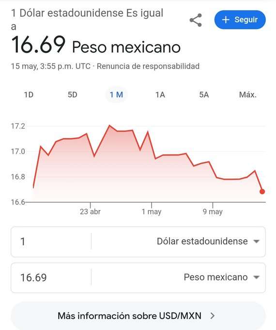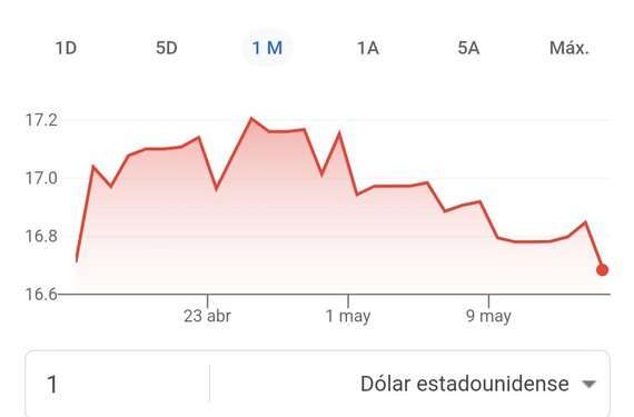 - El tipo de cambio al inicio del 15 de mayo de 2024 se sitúa en 16.77 unidades por dólar.