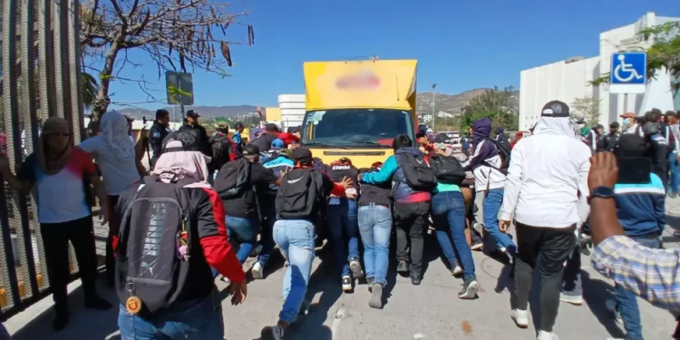 Frente al edificio gubernamental, los normalistas colocaron la unidad comercial en neutral y la proyectaron sobre una de las puertas laterales, logrando abrirla al recibir el impacto. A pesar de la presencia de un reducido grupo de elementos de la Policía del Estado, estos se limitaron a formar una columna sin intervenir de manera directa.
