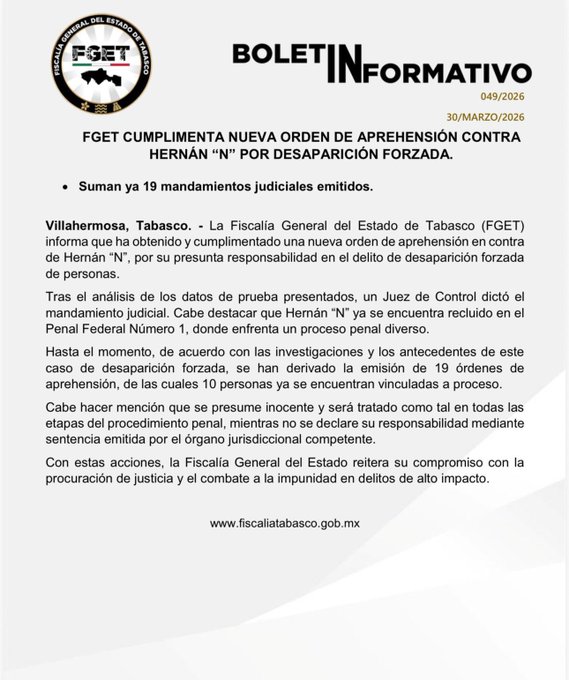 La Fiscalía General del Estado de Tabasco informó que esta imputación deriva de una nueva orden de aprehensión obtenida tras la presentación de datos de prueba ante el juez.