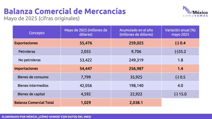 En mayo de 2025, las exportaciones totales de México disminuyeron 0.4% anual, con un valor de 55,476.4 millones de dólares, informó el INEGI. La baja fue provocada principalmente por la caída en las ventas del sector automotriz y de productos petroleros.