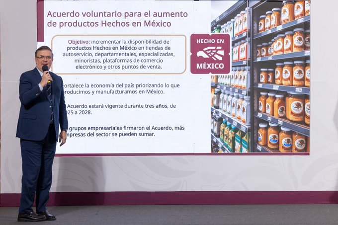 El secretario de Economía, Marcelo Ebrard, presentó un acuerdo voluntario con 22 empresas del sector comercial para aumentar la presencia de productos hechos en México. El anuncio se hizo durante la conferencia matutina del 15 de mayo en Palacio Nacional, como parte del Plan México.