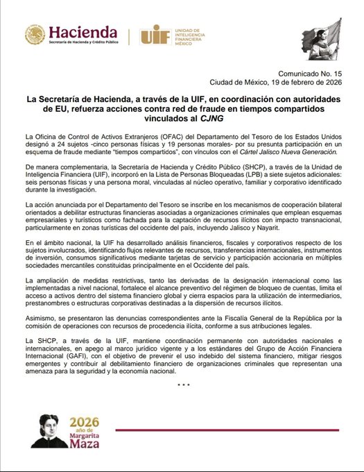 La Secretaría de Hacienda y Crédito Público informó que, a través de la Unidad de Inteligencia Financiera, incorporó a siete personas —seis físicas y una moral— a la Lista de Personas Bloqueadas por su presunta participación en un esquema de fraude de tiempos compartidos vinculado al Cártel Jalisco Nueva Generación.