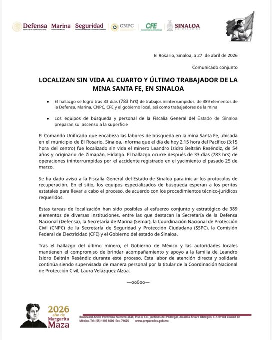 El cuerpo del cuarto y último trabajador atrapado en la mina Santa Fe, ubicada en el municipio de El Rosario, Sinaloa, fue localizado sin vida tras 33 días de labores ininterrumpidas. La víctima fue identificada como Leandro Isidro Beltrán Reséndiz, de 54 años, originario de Zimapán, Hidalgo.