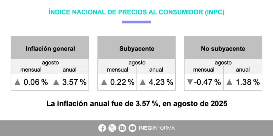 El Instituto Nacional de Estadística y Geografía (Inegi) informó que en agosto la inflación anual llegó a 3.57%, ligeramente por encima del 3.51% de julio. Con este resultado se interrumpió la tendencia a la baja de los dos meses previos, aunque la tasa se mantiene dentro del rango objetivo del Banco de México (3% +/- 1 punto).