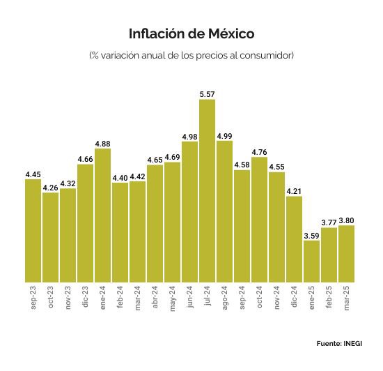 Durante marzo de 2025, la inflación en México se ubicó en 3.80% a tasa anual, registrando su segundo mes consecutivo con aumentos. El Instituto Nacional de Estadística y Geografía (Inegi) informó que el Índice Nacional de Precios al Consumidor (INPC) subió 0.31% respecto a febrero.