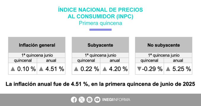 En la primera quincena de junio, la inflación general anual en México se ubicó en 4.51%, según datos del Instituto Nacional de Estadística y Geografía (Inegi). En comparación con la quincena anterior, el Índice Nacional de Precios al Consumidor (INPC) aumentó 0.10%. Un año antes, en el mismo periodo, la inflación anual fue de 4.78% y la quincenal de 0.21%.