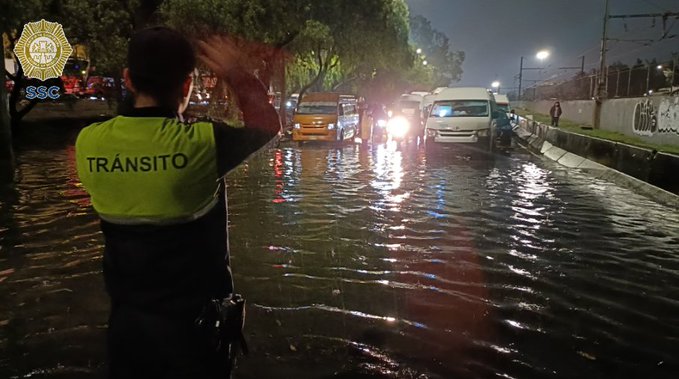 Protección Civil, Bomberos y elementos de la Secretaría de Seguridad Ciudadana trabajan en la zona para facilitar el drenaje, aunque las labores se complican debido a la basura acumulada y la cantidad de agua. Solo camiones especiales para desazolve podrían mejorar la situación, señalaron.
