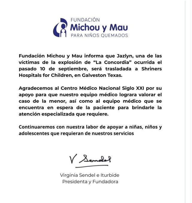 La fundación Michou y Mau informó que Jazlyn, la niña rescatada por su abuela durante la explosión de una pipa en el Puente de la Concordia (Iztapalapa), será trasladada a Estados Unidos para recibir atención especializada en Shriners Hospitals for Children, Galveston, Texas.