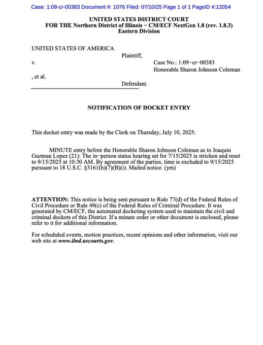 Este viernes 12 de julio, su hermano Ovidio Guzmán también comparecerá ante la misma corte y jueza, Sharon Johnson Coleman, donde se espera que formalice su declaración de culpabilidad tras llegar a un acuerdo con el gobierno estadounidense.