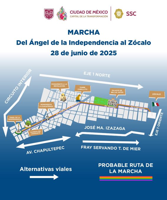 La Marcha del Orgullo LGBTIQ+ se realizará este sábado 28 de junio en la Ciudad de México. La cita es a las 10:00 de la mañana en el Ángel de la Independencia. El recorrido comenzará entre las 11:00 y 12:00 h, avanzando por Paseo de la Reforma, avenida Juárez, Eje Central y calle 5 de Mayo, hasta llegar al Zócalo capitalino.