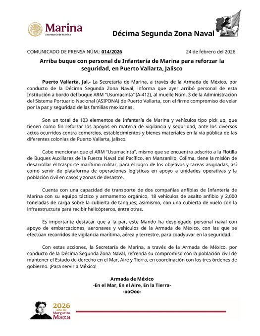 La Secretaría de Marina (Semar) desplegó 103 elementos de Infantería de Marina en Puerto Vallarta, Jalisco, con el objetivo de fortalecer las labores de vigilancia y seguridad tras los recientes actos violentos registrados en la entidad.
