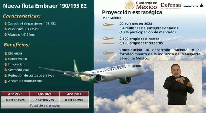 Mexicana de Aviación, aerolínea estatal operada por la Secretaría de la Defensa Nacional, busca alcanzar el 4.8% del mercado nacional en 2028. Su objetivo es transportar 3.4 millones de pasajeros al año con una flota de 20 aviones. Actualmente, la aerolínea ha movilizado más de 600 mil pasajeros desde su relanzamiento.
