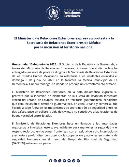 La Secretaría de Relaciones Exteriores (SRE) ofreció disculpas al gobierno de Guatemala tras la incursión de policías estatales de Chiapas a territorio guatemalteco el pasado 8 de junio. A través de una nota diplomática, México reconoció el error y reafirmó su respeto por la soberanía y el derecho internacional.