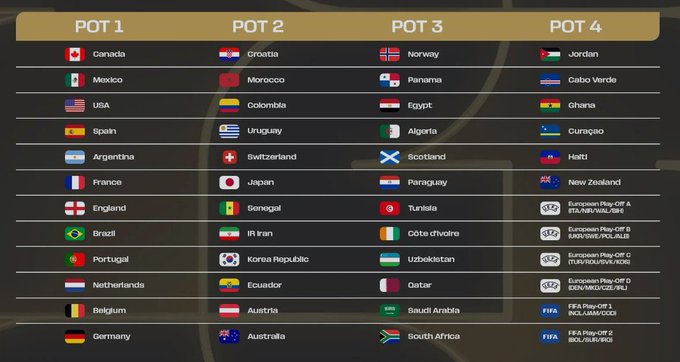 Las selecciones se asignan a cuatro bombos según su ranking FIFA. En el bombo 1 figuran México, Estados Unidos y Canadá como anfitriones, junto con España, Argentina, Francia, Inglaterra, Brasil, Portugal, Países Bajos, Bélgica y Alemania. Europa podrá tener hasta dos equipos por grupo; las demás confederaciones solo uno.
