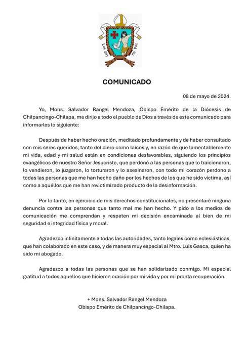 En un comunicado emitido este miércoles 8 de mayo, el Obispo Salvador Rangel expresó su gratitud hacia todas las autoridades y personas que colaboraron en su caso, tanto en el ámbito legal como eclesiástico.