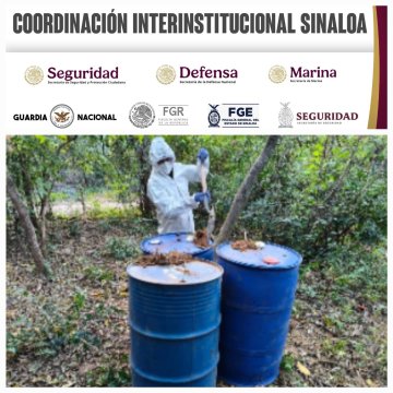 Elementos del Ejército realizaron recorridos en Culiacán, Cosalá y Badiraguato, donde localizaron áreas empleadas para almacenar sustancias químicas y operar laboratorios clandestinos vinculados a la producción de drogas sintéticas. Durante estas acciones se aseguraron más de 3,500 litros de químicos y diverso equipo industrial.