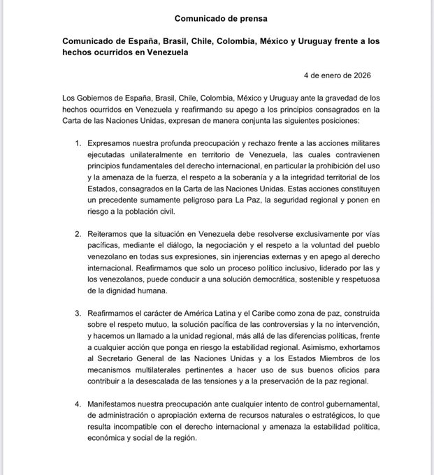 Los gobiernos de Brasil, Chile, Colombia, España, México y Uruguay emitieron un pronunciamiento conjunto para rechazar las acciones militares realizadas por Estados Unidos en territorio venezolano, durante las cuales fueron detenidos Nicolás Maduro y su esposa Cilia Flores. Los seis países advirtieron que la operación vulnera principios esenciales del derecho internacional, como la prohibición del uso de la fuerza, el respeto a la soberanía y la integridad territorial de los Estados.