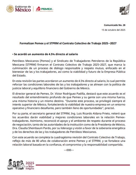 Petróleos Mexicanos (Pemex) y el Sindicato de Trabajadores Petroleros de la República Mexicana (STPRM) firmaron el Contrato Colectivo de Trabajo 2025-2027, que incluye un aumento salarial del 4.5% para los empleados sindicalizados.