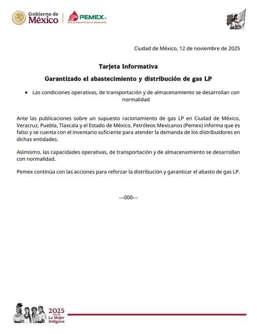 Petróleos Mexicanos (Pemex) informó que el suministro y distribución de gas licuado de petróleo (LP) se mantiene con normalidad en todo el país, tras versiones sobre un presunto racionamiento en Ciudad de México, Estado de México, Veracruz, Puebla y Tlaxcala.