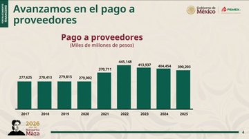 Como parte de esta estrategia, Pemex implementó un programa de financiamiento coordinado con Banobras y la Secretaría de Hacienda, mediante el cual se pagaron alrededor de 390 mil millones de pesos a proveedores durante el segundo semestre de 2025.