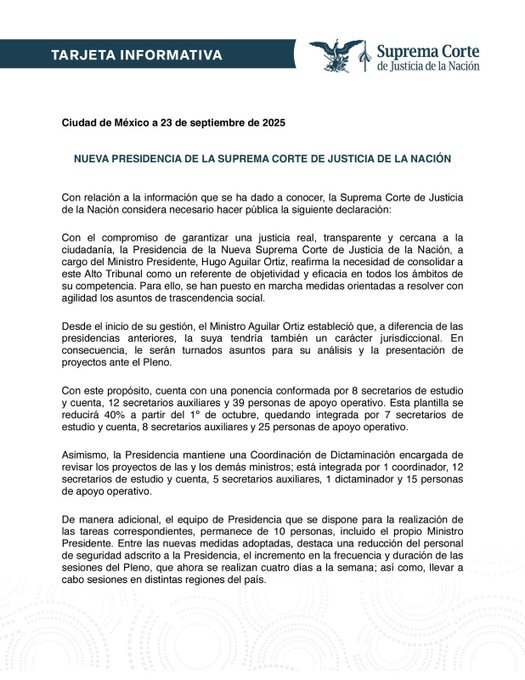 Aguilar informó que también se redujo el personal de seguridad asignado a la Presidencia y que el pleno de la Corte sesionará cuatro veces por semana, incluso en distintas regiones del país. Además, aseguró que toda la información sobre personal será publicada en la página oficial de la SCJN.