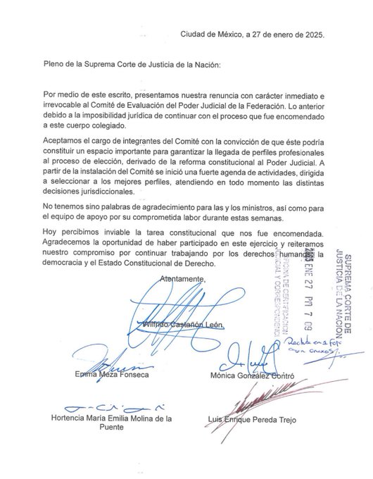 “Presentamos nuestra renuncia inmediata e irrevocable al Comité de Evaluación del Poder Judicial de la Federación debido a la imposibilidad jurídica de continuar con el proceso asignado a este cuerpo colegiado”, señala el documento.