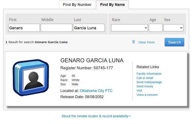 El sistema oficial del BOP indica que García Luna se encuentra registrado en esta prisión bajo el número de interno 59745-177, sin especificar la fecha ni las razones del traslado. Su liberación está programada para el 8 de agosto de 2052.