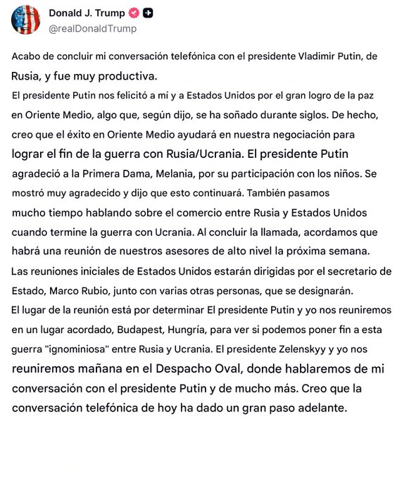 A través de su plataforma Truth Social, Trump informó que la conversación fue “larga y muy productiva”. “Ambos coincidimos en seguir trabajando por la paz y en mantener canales abiertos de diálogo”, señaló. Según el Kremlin, la llamada fue “franca y de confianza” y se realizó a iniciativa de Rusia.